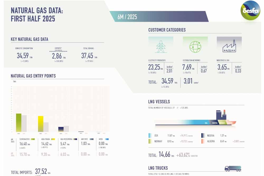 Ειδικότερα, κατά το διάστημα Ιανουάριος – Ιούνιος 2025, η συνολική ζήτηση φυσικού αερίου στην Ελλάδα, συπεριλαμβάνοντας και τις εξαγωγές, ανήλθε σε 37,45 TWh, αυξημένη κατά 19.96 % σε σχέση με 31,22 TWh στο α’ εξάμηνο του 2024. Αξιοσημείωτη ήταν η αύξηση των εξαγωγών φυσικού αερίου, μέσω των σημείων διασύνδεσης Σιδηροκάστρου και Νέας Μεσημβρίας, οι οποίες ανήλθαν σε 2,86 TWh, από 0,44 TWh την προηγούμενη χρονιά — αύξηση που ξεπερνά το +550%.