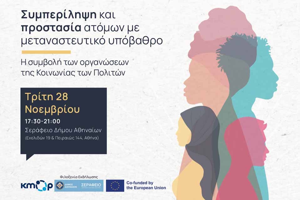 Για αυτό, το ΚΜΟΠ μας καλεί να συζητήσουμε πώς η συμπερίληψη ατόμων με μεταναστευτικό υπόβαθρο μπορεί να ωφελήσει όλη την κοινωνία, στην εκδήλωση που διοργανώνει την Τρίτη 28 Νοεμβρίου 2023, στις 17:30-21:00, στο Σεράφειο (Εχελιδών 19 & Πειραιώς 144, Αθήνα), με θέμα «Συμπερίληψη και προστασία ατόμων με μεταναστευτικό υπόβαθρο: Η συμβολή των οργανώσεων της Κοινωνίας των Πολιτών». Η συμμετοχή είναι δωρεάν.
