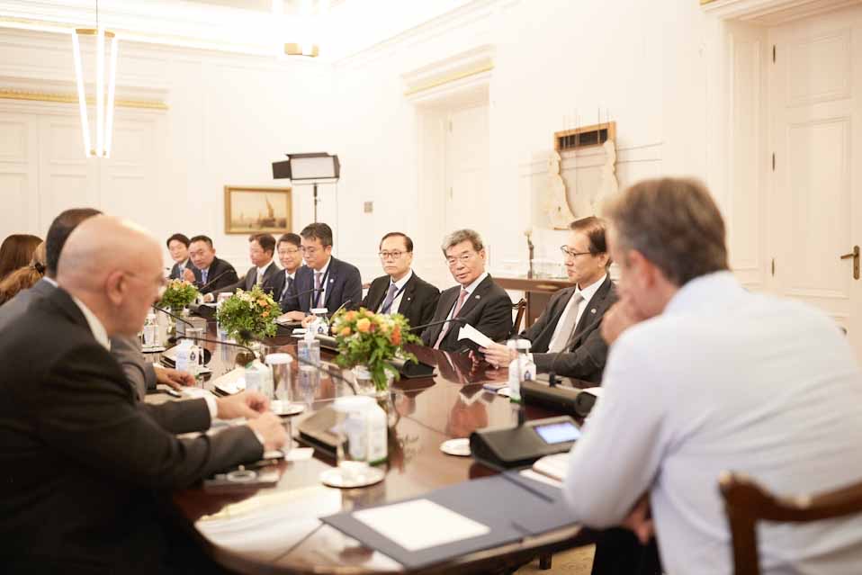 Η κορεάτικη αντιπροσωπεία αποτελούνταν από τον πρόεδρο του Εμπορικού και Βιομηχανικού Επιμελητηρίου της Κορέας και πρόεδρο του SK Group, Chey Taewon, τον εκτελεστικό αντιπρόεδρο για την Καινοτομία του SK Group, Yoosuk Kim, τον αντιπρόεδρο και διευθύνοντα σύμβουλο της Hyundai Heavy Industries, Ka Sam Hyun, τον πρόεδρο των Hanwha Aerospace και Hanwha Foundation of Culture, Shin Hyun Woo, τον αντιπρόεδρο της Hyundai Motor Europe, Kim Yong Jin, τον αντιπρόεδρο του Εμπορικού και Βιομηχανικού Επιμελητηρίου Κορέας, Lee Seong Woo και τον αντιπρόεδρο και γενικό διευθυντή Επιχειρήσεων της Export-Import Bank of Korea, Kwon Woo Seog. Στη σύσκεψη έλαβε μέρος επίσης ο πρέσβης της Δημοκρατίας της Κορέας στην Ελλάδα, Lee Jung Il.