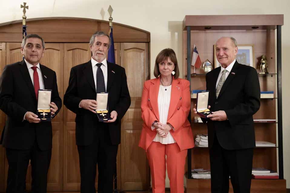 Νωρίτερα, η Πρόεδρος της Δημοκρατίας, σε ειδική τελετή στην ελληνική πρεσβεία, απένειμε το παράσημο του Ταξιάρχη του Τάγματος του Φοίνικος στους Pedro Ignacio Vicuña Navarro του Jose Miguel, ηθοποιό, ποιητή, θεατρικό συγγραφέα και μεταφραστή, Dr Alex Eduardo Guerra Sclavos του Augusto Eduardo, ιατρό, άμισθο πρόξενο της Ελλάδας στο Valparaiso και Anesti Demetrio Papasideris Ochoa του Anesti, χημικό μηχανικό, άμισθο πρόξενο της Ελλάδας στην Antofagasta.