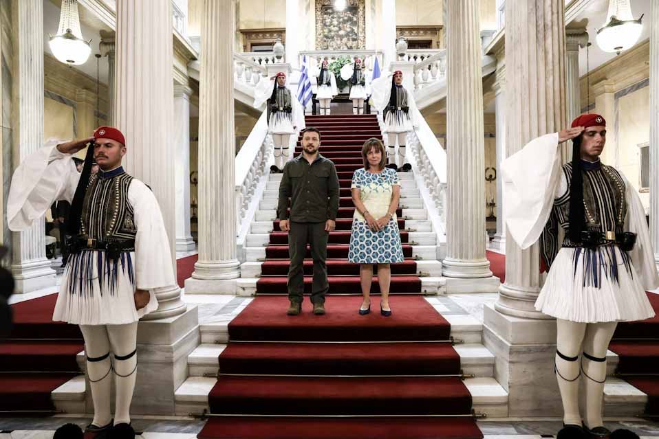 Κύριε Πρόεδρε, με ιδιαίτερη χαρά, σας καλωσορίζω στην Αθήνα και στο Προεδρικό Μέγαρο. Όταν τον περασμένο Νοέμβριο επισκέφθηκα το Κίεβο είχα την ευκαιρία να τονίσω, και θα το επαναλάβω και σήμερα, ότι η Ελλάδα στέκεται και θα συνεχίσει να στέκεται σταθερά στο πλευρό του γενναίου ουκρανικού λαού, που αγωνίζεται για την ανεξαρτησία και την κυριαρχία της χώρας σας, απέναντι στον απρόκλητο και παράνομο επιθετικό πόλεμο της Ρωσίας. Είχα επίσης την ευκαιρία, επισκεπτόμενη τις πόλεις κοντά στο Κίεβο, το Ιρπίν, την Μποροντιάνκα, την Μπούτσα, να διαπιστώσω με τα ίδια μου τα μάτια τις καταστροφικές συνέπειες της ρωσικής εισβολής, αλλά και τη γενναιότητα του ουκρανικού λαού.