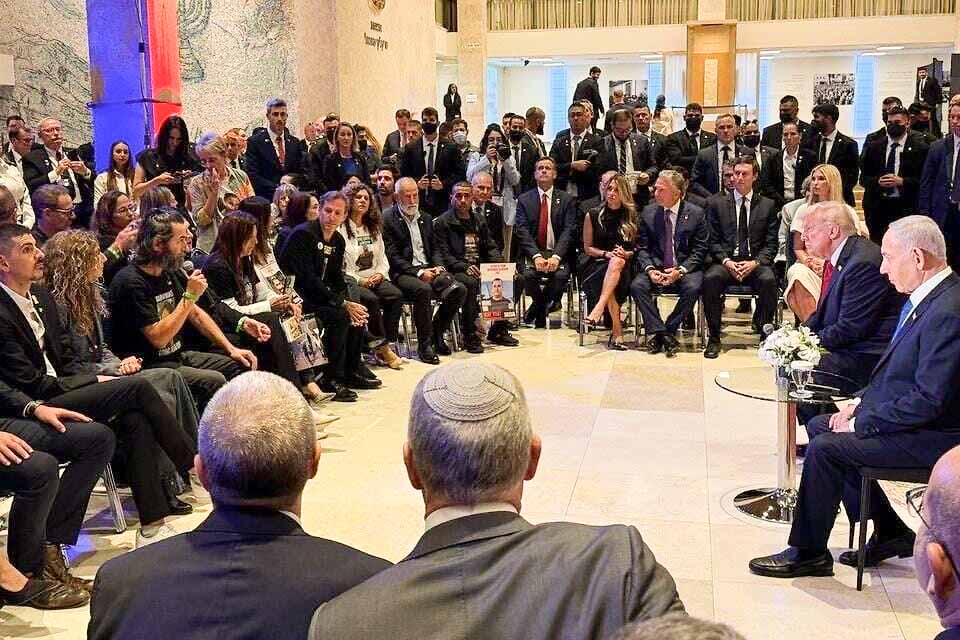 Ο Ισραηλινός πρωθυπουργός Μπενιαμίν Νετανιάχου και ο πρόεδρος των ΗΠΑ Ντόναλντ Τραμπ πραγματοποιούν συνάντηση με οικογένειες ομήρων στην Κνεσέτ.