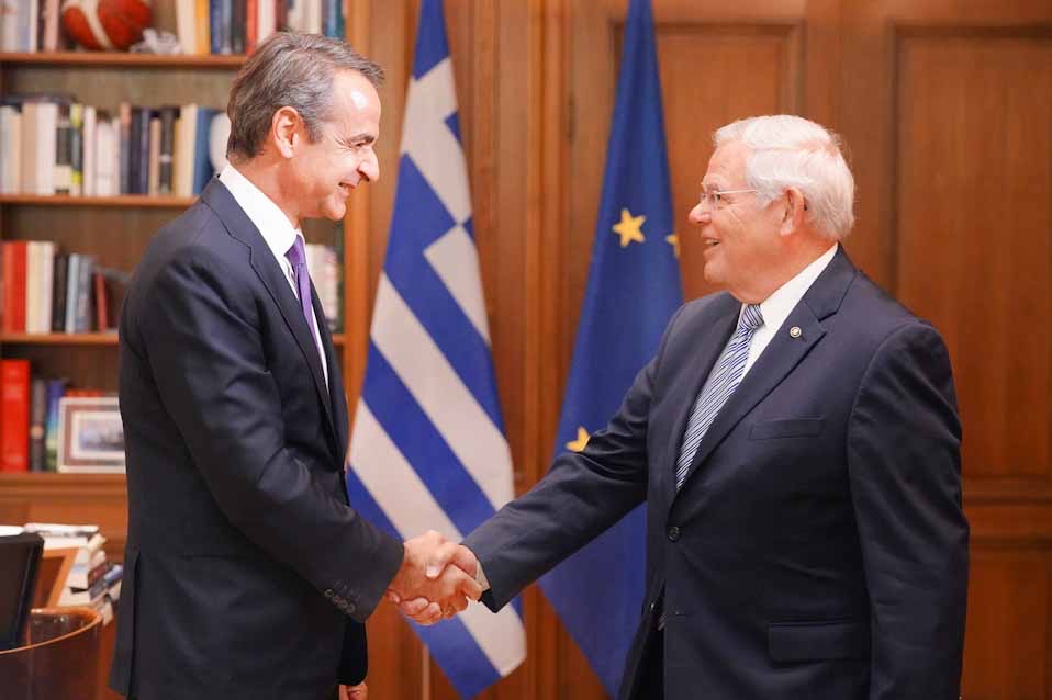 Ο Πρωθυπουργός Κυριάκος Μητσοτάκης συναντήθηκε, στο Μέγαρο Μαξίμου, με τον Πρόεδρο της Επιτροπής Εξωτερικών Σχέσεων της Γερουσίας των Ηνωμένων Πολιτειών, Robert Menendez, λίγο πριν από την αναγόρευσή του Αμερικανού Γερουσιαστή σε Επίτιμο Διδάκτορα του ΕΚΠΑ.