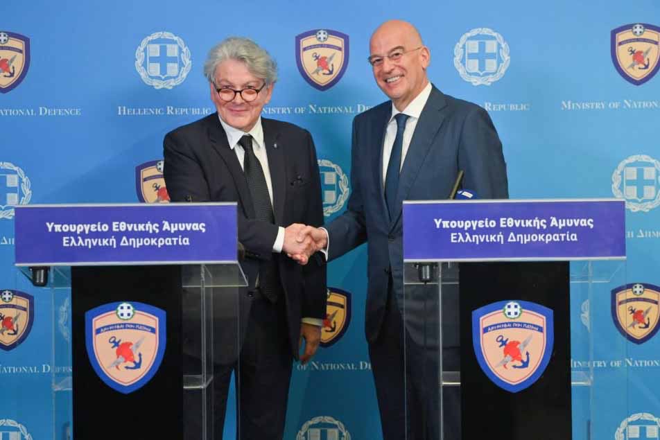 Ο Υπουργός Εθνικής Άμυνας Νίκος Δένδιας, υποδέχθηκε σήμερα Τετάρτη 19 Ιουνίου 2024, στο Υπουργείο Εθνικής Άμυνας, τον Επίτροπο Εσωτερικής Αγοράς της Ευρωπαϊκής Ένωσης Thierry Breton, αρμόδιο μεταξύ άλλων για την ενδυνάμωση της τεχνολογικής ανεξαρτησίας, της τεχνητής νοημοσύνης, της αμυντικής και διαστημικής τεχνολογίας και κυβερνοασφάλειας, καθώς και για την ανάπτυξη του Κοινού Ταμείου Άμυνας.