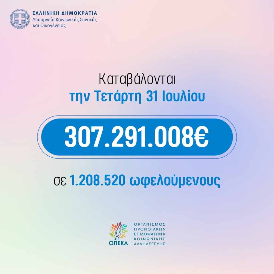 Το Υπουργείο Κοινωνικής Συνοχής και Οικογένειας, με τον εποπτευόμενο Οργανισμό Προνοιακών Επιδομάτων και Κοινωνικής Αλληλεγγύης (ΟΠΕΚΑ), ενημερώνουν ότι την Τετάρτη 31/8, θα καταβληθούν τα επιδόματα για τον μήνα Ιούλιο, συνολικού ύψους 307.291.008 ευρώ.
