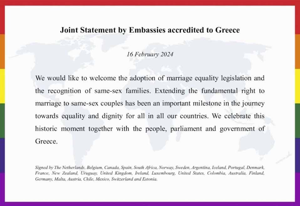 Σε κοινή τους δήλωση, οι 28 ξένες διπλωματικές αντιπροσωπείες στην Ελλάδα τονίζουν ότι «η επέκταση του θεμελιώδους δικαιώματος του γάμου στα ομόφυλα ζευγάρια αποτέλεσε σημαντικό ορόσημο στην πορεία προς την ισότητα, την αξιοπρέπεια για όλους σε όλες τις χώρες μας».