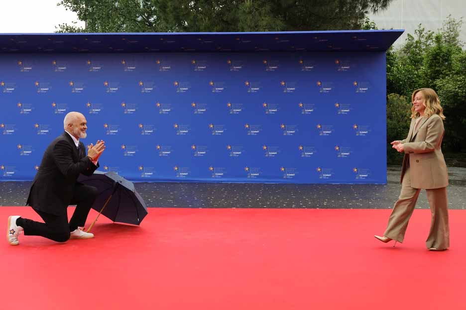Ο πρωθυπουργός της Αλβανίας Έντι Ράμα, υποδέχθηκε γονατιστός την Τζόρτζια Μελόνι, στη Σύνοδο Κορυφής στα Τίρανα.