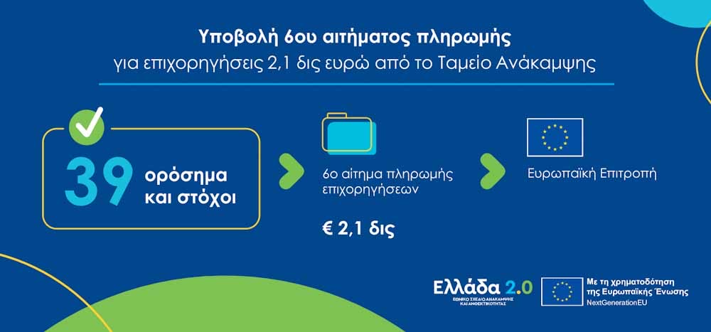 Ο Αναπληρωτής Υπουργός Εθνικής Οικονομίας και Οικονομικών, Νίκος Παπαθανάσης, υπέβαλε σήμερα στην Ευρωπαϊκή Επιτροπή το έκτο αίτημα εκταμίεσης πόρων από το Ταμείο Ανάκαμψης και Ανθεκτικότητας, ύψους 2,1 δισ. ευρώ σε επιχορηγήσεις, μετά από την εκπλήρωση 39 νέων οροσήμων και στόχων.