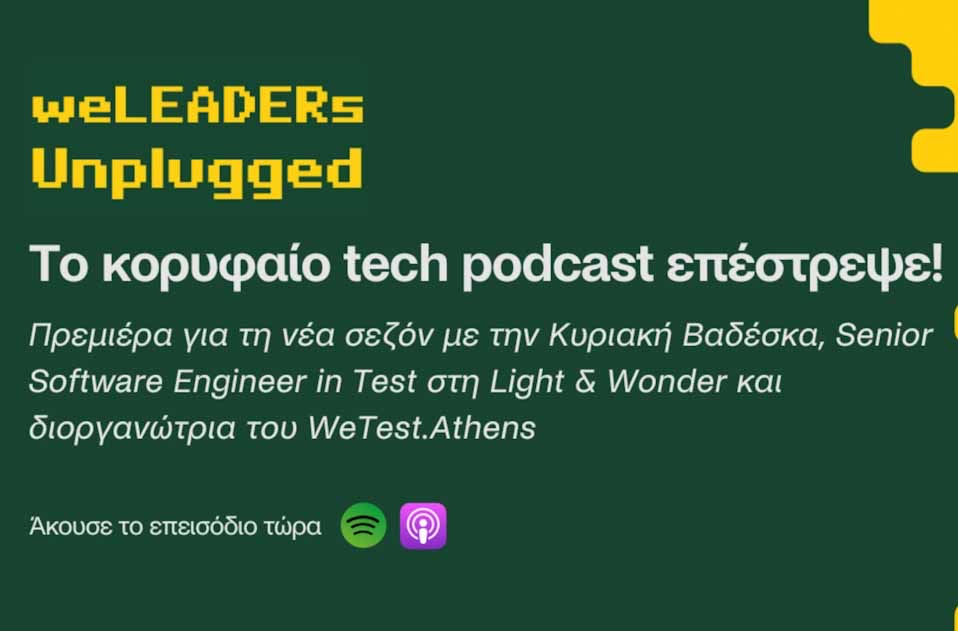 Αν πάλι είσαι από τους fans που έχουν ακούσει ήδη όλα τα επεισόδια, σου έχουμε καλά νέα! Το #weLEADERs Unplugged, σε παραγωγή και επιμέλεια από την ομάδα της αθηΝΕΑ, επέστρεψε, ξεκινώντας με μία εφ’ όλης της ύλης συζήτηση γύρω από το Software Testing, με την Κυριακή Βαδέσκα, Senior Software Engineer in Test στη Light & Wonder και διοργανώτρια του WeTest.Athens. Συντονίσου τώρα. Άκουσε το στο Spotify, και ακολούθησε το WE LEAD στο Instagram και LinkedIn για να είσαι πάντα ενημερωμένη/ος.