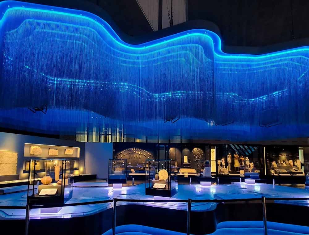 Η κεντρική σκάλα, που οδηγεί σε ένα εσωτερικό αίθριο, φιλοξενεί το κολοσσιαίο άγαλμα του Ραμσή Β’, ύψους 11 μέτρων — έναν επιβλητικό προάγγελο της εμπειρίας που περιμένει τον επισκέπτη.
