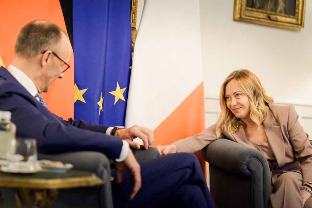 «Η σημερινή μας συνομιλία αποτελεί την πιο αποτελεσματική διάψευση της φημολογούμενης έλλειψης ενδιαφέροντος της νέας γερμανικής κυβέρνησης για τη χώρα μας», δήλωσε η Ιταλίδα πρωθυπουργός Τζόρτζια Μελόνι μετά την ολοκλήρωση της σημερινής της συνάντησης με τον Γερμανό καγκελάριο Φρίντριχ Μερτς στο κυβερνητικό μέγαρο της Ρώμης, Παλάτσο Κίτζι.