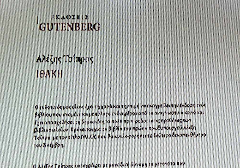 «Ο εκδοτικός μας οίκος έχει τη χαρά και την τιμή να αναγγείλει την έκδοση ενός βιβλίου που αναμένεται με εύλογο ενδιαφέρον από το αναγνωστικό κοινό και έχει απασχολήσει τη δημοσιότητα πολύ πριν φτάσει στις προθήκες των βιβλιοπωλείων. Πρόκειται για το βιβλίο του πρώην πρωθυπουργού Αλέξη Τσίπρα με τον τίτλο ΙΘΑΚΗ, που θα κυκλοφορήσει το δεύτερο δεκαπενθήμερο του Νοέμβρη.