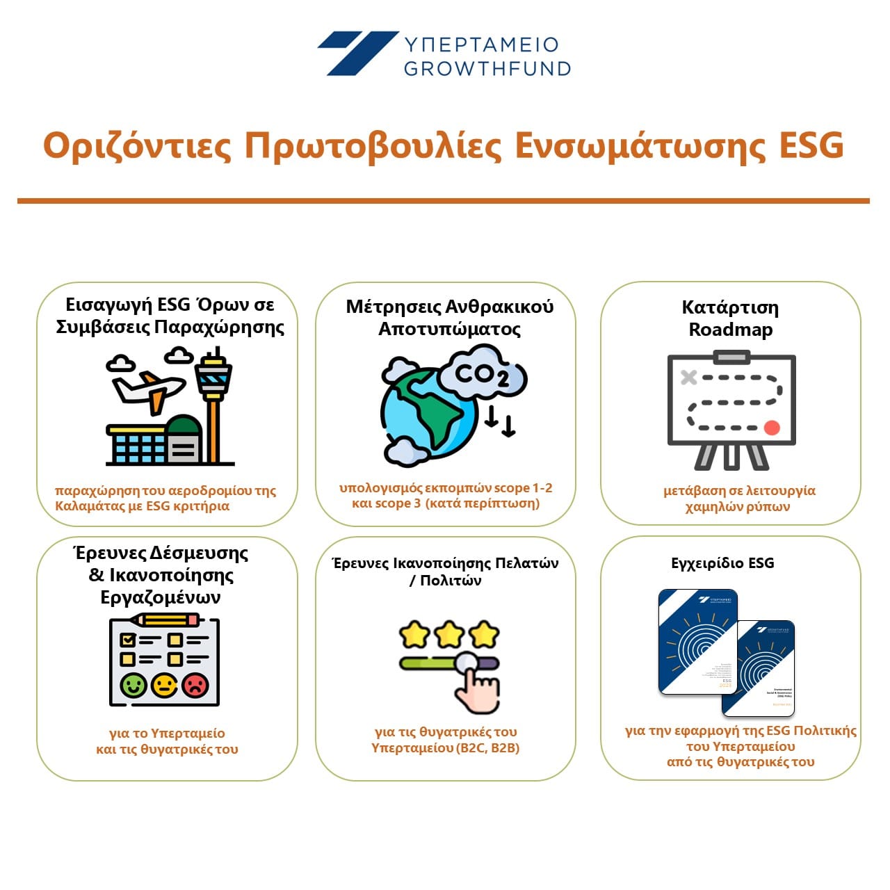 Ως Ενεργός Μέτοχος το Υπερταμείο ζητά από τις θυγατρικές του να υλοποιούν εξειδικευμένα ESG action plans και ESG KPIs που περιλαμβάνουν δράσεις όπως ετήσιες Μετρήσεις Ανθρακικού Αποτυπώματος Scope 1 & 2, οδικούς χάρτες για τη μείωση του ανθρακικού αποτυπώματος, Έρευνες Ικανοποίησης Πελατών/Πολιτών αλλά και Έρευνες Δέσμευσης και Ικανοποίησης Εργαζομένων. Επιπλέον, το Υπερταμείο για πρώτη φορά διαβουλεύτηκε με τους υποψηφίους επενδυτές της παραχώρησης στο Αεροδρόμιο Καλαμάτας, για την ενσωμάτωση όρων ESG στον διαγωνισμό.