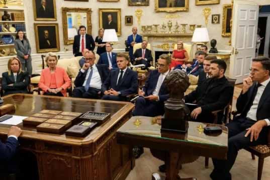 Στο άνευ προηγουμένου διπλωματικό μπαλέτο ο γενικός γραμματέας του NATO Μαρκ Ρούτε, η πρόεδρος της Ευρωπαϊκής Επιτροπής Ούρσουλα φον ντερ Λάιεν, ο πρωθυπουργός της Βρετανίας Κιρ Στάρμερ, ο γερμανός καγκελάριος Φρίντριχ Μερτς, η πρωθυπουργός της Ιταλίας Τζόρτζα Μελόνι, ο πρόεδρος της Φινλανδίας Αλεξάντερ Στουμπ και ο πρόεδρος της Γαλλίας Εμανουέλ Μακρόν αφίχθησαν ο ένας μετά τον άλλο στον Λευκό Οίκο για να σταθούν γύρω από τον ουκρανό πρόεδρο.