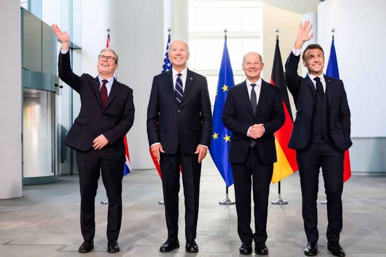 Σε κοινή δήλωση που δόθηκε στη δημοσιότητα μετά την τετραμερή συνάντηση στο Βερολίνο, ο Τζο Μπάιντεν, ο Εμανουέλ Μακρόν, ο Όλαφ Σολτς και ο Κιρ Στάρμερ δεσμεύονται να «συνεχίσουν να υποστηρίζουν την Ουκρανία στις προσπάθειές της να εξασφαλίσει μια δίκαιη και διαρκή ειρήνη, βασισμένη στο διεθνές δίκαιο, συμπεριλαμβανομένου του Χάρτη των Ηνωμένων Εθνών και στον σεβασμό της κυριαρχίας και της εδαφικής ακεραιότητας».