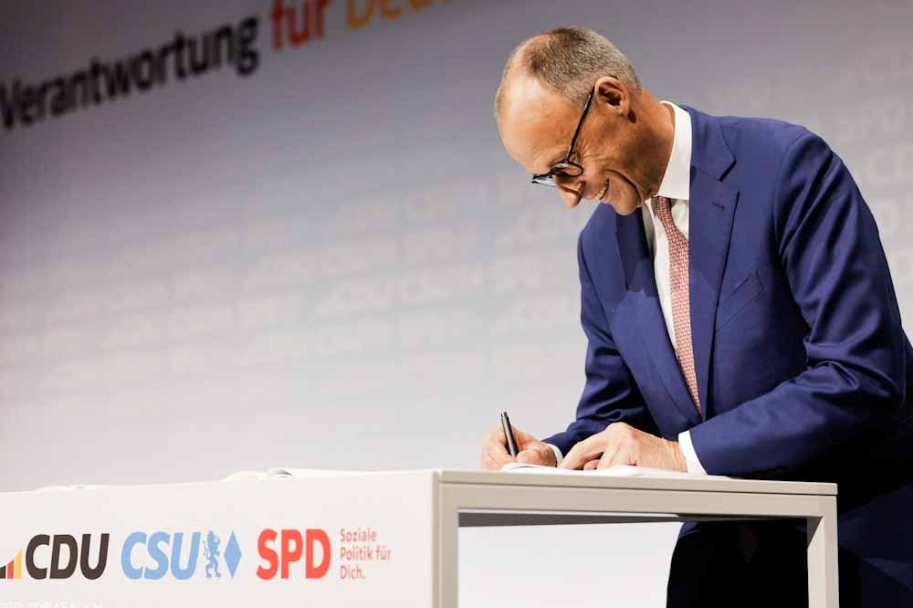 Η Χριστιανική Ένωση (CDU/CSU) και το Σοσιαλδημοκρατικό Κόμμα (SPD) υπέγραψαν νωρίτερα σήμερα την προγραμματική συμφωνία τους, ανοίγοντας και τυπικά τον δρόμο για τον σχηματισμό του νέου ομοσπονδιακού κυβερνητικού συνασπισμού υπό τον αρχηγό του Χριστιανοδημοκρατικού Κόμματος (CDU) Φρίντριχ Μερτς, ο οποίος υποσχέθηκε «συστηματική και δυναμική εργασία από την πρώτη μέρα».