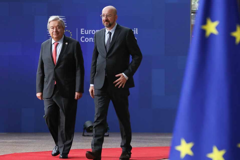 Κατά την άφιξή του στο Ευρωπαϊκό Συμβούλιο, ο Αντόνιο Γκουτέρες δήλωσε ότι «ζούμε σε έναν χαοτικό κόσμο» και είναι πολύ σημαντικό να τηρούμε τις αρχές: τη Χάρτα των Ηνωμένων Εθνών, το Διεθνές Δίκαιο, την εδαφική ακεραιότητα των χωρών και το διεθνές ανθρωπιστικό δίκαιο. «Αυτός είναι ο λόγος για τον οποίο πιστεύουμε ότι είναι απαραίτητο να υπάρχει ειρήνη για την Ουκρανία, αλλά πλήρως εναρμονισμένη με τις αρχές», ανέφερε και πρόσθεσε ακόμη ότι: «Χρειαζόμαστε κατάπαυση του πυρός στη Γάζα».