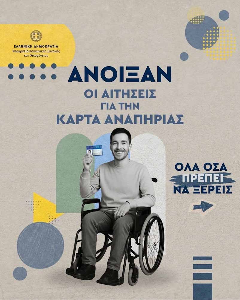 Ξεκίνησαν σήμερα Τρίτη 18 Νοεμβρίου 2025 οι αιτήσεις για την έκδοση της πλαστικής Κάρτας Αναπηρίας. Είναι ένα σημαντικό βήμα για τη διεύρυνση των δικαιωμάτων των ατόμων με αναπηρία και τη διευκόλυνση της καθημερινότητάς τους, συμπληρώνοντας τις δύο ήδη διαθέσιμες μορφές της, την εκτυπώσιμη και την ψηφιακή μέσω Gov.gr Wallet.