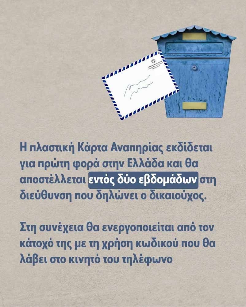 Η πλαστική Κάρτα Αναπηρίας εκδίδεται για πρώτη φορά και θα αποστέλλεται εντός δύο εβδομάδων με συστημένη επιστολή στη διεύθυνση που δηλώνει ο δικαιούχος. Στη συνέχεια θα ενεργοποιείται από τον κάτοχό της με τη χρήση κωδικού που θα λάβει στο κινητό του τηλέφωνο.