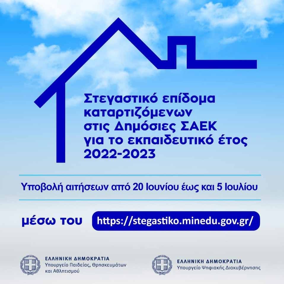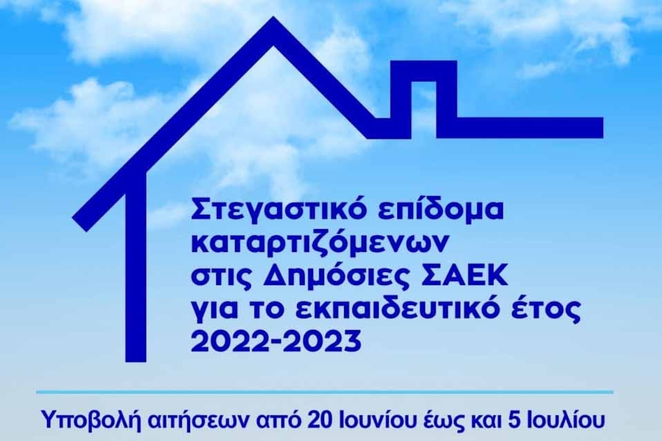 Τα Υπουργεία Παιδείας, Θρησκευμάτων και Αθλητισμού και Ψηφιακής Διακυβέρνησης ανακοινώνουν ότι από σήμερα, Πέμπτη 20 Ιουνίου,ξεκίνησε η υποβολή αιτήσεων χορήγησης στεγαστικού επιδόματος για καταρτιζόμενους των Δημοσίων Σχολών Ανώτερης Επαγγελματικής Κατάρτισης (ΣΑΕΚ – πρώην ΙΕΚ) για το εκπαιδευτικό έτος 2022-2023.