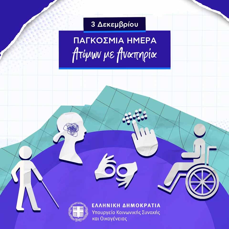 Η Παγκόσμια Ημέρα Ατόμων με Αναπηρία καθιερώθηκε πριν 3 δεκαετίες από τη Γενική Συνέλευση του ΟΗΕ και έκτοτε αποτελεί σημείο αναφοράς για την πρόοδο που σημειώνουμε ως κοινωνία στην εξάλειψη των διακρίσεων και την εξασφάλιση ίσων ευκαιριών για τα άτομα με αναπηρία.